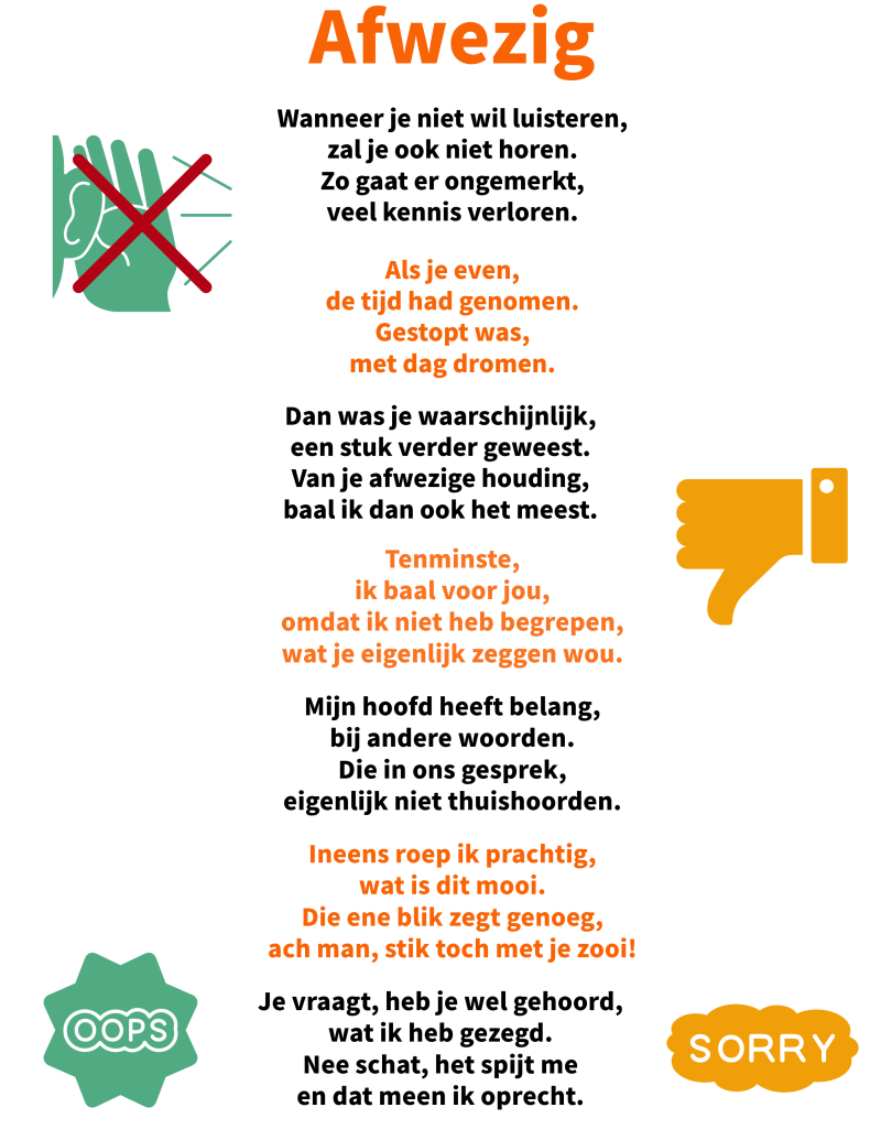 Wanneer ik met iets bezig ben en mijn vrouw tegen mij praat, krijg ik er niks van mee wat ze zegt. Dit terwijl ik wel ja knik of zeg. Dat is waar dit gedicht over gaat.