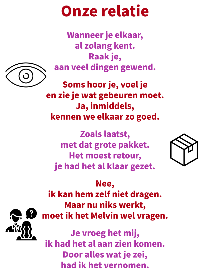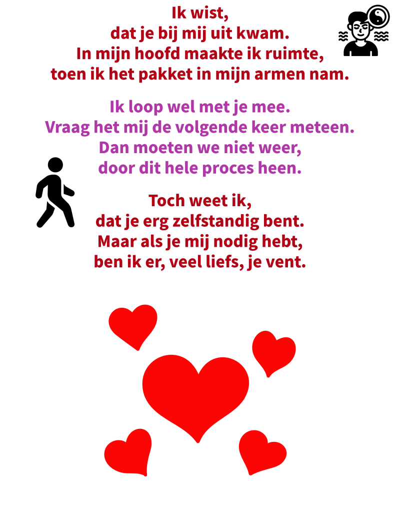 Vandaag een gedicht over de relatie met mijn vrouw. Het gedicht illustreert mooi hoe mijn vrouw en ik met elkaar en bepaalde situaties omgaan.