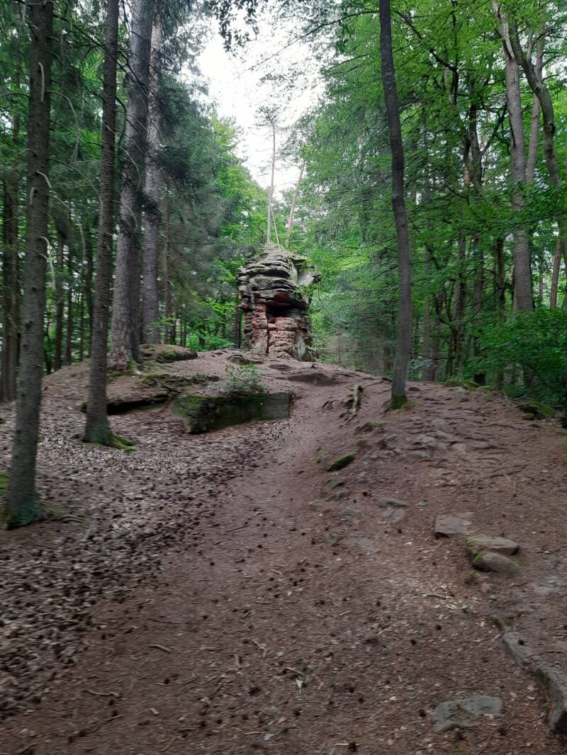 Na het prachtige uitzicht boven op de rots vervolgden we onze route richting de Neudahn. Over prachtige bospaadjes en rotspartijen slingerden we als het ware rond Dahn. Zo kamen we erachter dat Dahn als het ware in een “U” vorm om een berg is heen gebouwd. Hier en daar waren ook nog wat uitzichtpunten met een bankje. Hier kon je prachtig de omgeving bekijken en de drie burchten zien waar we net waren geweest. We kwamen zelfs nog een groep Nederlanders tegen die aan het mountainbiken waren. Een aantal paden waren heel breed en het leek wel alsof deze eeuwen geleden al waren aangelegd. Sommige rotsen leken bewerkt. Misschien haalden ze daar wel stenen vandaan voor de bouw van de burchten? Dat idee kregen mijn vader en ik in ieder geval.