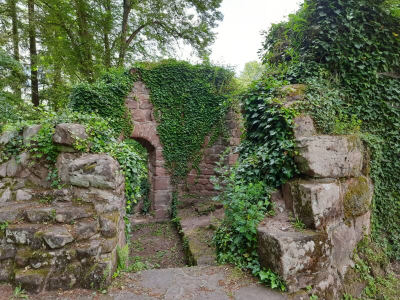 Via het bos kwamen we uiteindelijk in Dahn terecht en moesten we een weg en spoorweg overgang oversteken. Nog een smal gangetje door, over een brug en toen kwamen we weer bij een bos. Daar begon wederom een steile klim. Na die steile klim moesten we nog een paar kilometer en dan waren we bij de burcht Neudahn.